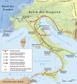 ![]() Мапа воєнний дій під час Готської війни 535-554 років Мапа воєнний дій під час Готської війни 535-554 років | |||||||||