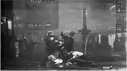 На немолодого джентльмена в циліндрі нападають троє грабіжників, до нього на виручку поспішає полісмен. Втім, перед представником закону трійця пасувати не має наміру.