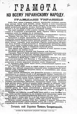 «Грамота до всього українського народу» сповіщала українське населення про повалення Центральної ради і уряду Української Народної Республіки, а також проголошувала встановлення диктатури гетьмана Павла Скоропадського до часу обрання всеукраїнського парламенту — Сейму.