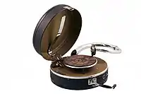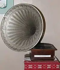 Грамофон (від грец. γραμμα — запис, φωνή — звук) — прилад, перша система запису і відтворення звуку з плоского диску — платівки, на відміну від фонавтографа, котрий записував на циліндрі. Це видозміна винайденого в 1877 році Едісоном фонографа, вперше зроблена Емілем Берлінером, який в тому ж році отримав патент на грамофон (26 вересня 1887). Для записування і відтворення звуків використовує ебонітові (каучукові) диски. Грамофонна голка, прикріплена до вібруючої мембрани, яка приймає звуки, наносить на диск відповідні спіральні риси та заглиблення. При обертанні диска за допомогою годинникового механізму голка рухається по спіральній канавці диска і викликає відповідні коливання вібруючої платівки: весь комплекс записаних звуків відтворюється з точністю. Патефонну платівку не можна використовувати на грамофоні, бо напрямок ходу патефонної голки йде від центру до краю платівки. Платівки, їх типи, тісно пов'язані зі звукознімальним приладом.