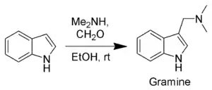 Грамін можна легко отримати за допомогою реакції Манніха із використанням індолу як вихідної речовини.