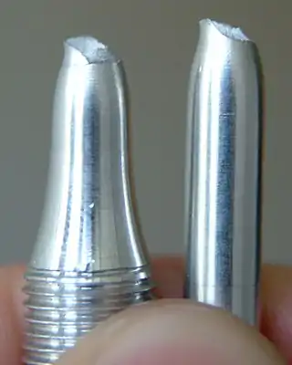Після досягнення зусилля при подальшому розтяганні зразка зона його деформації локалізується і спостерігається на невеликій його довжині. Це призводить до утворення місцевого звуження у вигляді шийки (див.рис.) і до зменшення сили розтягування R, попри те, що напруження у перерізі шийки безперервно зростає. Зменшення розтягувальної сили спостерігається лише при випробуваннях зразка у машині, яка обмежує швидкість зростання деформації (м'яке навантаження). При випробуванні шляхом контролю зростання навантаження (жорстке навантаження), руйнування відбудеться при постійному навантаженні, але із все зростаючою швидкістю.