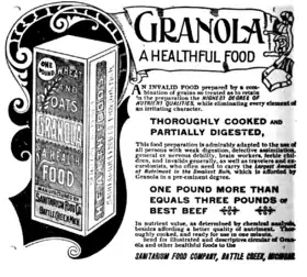 Продукт під найменуванням «гранула» був випущений в Денсвіллі лікарем Джеймсом Калеб Джексоном в його лікувальному профілакторії в другій половині XIX століття, рецептура ґрунтувалася на ідеології Грема — снек також випікався з борошна Грема. Спочатку з борошна робили тісто, потім розгортали тонкі пластини, які потім випікали. Наступним етапом пластини ламали на шматочки неправильної форми, які перемішували і запікали ще раз. Для випуску і збуту товару була зареєстрована компанія Jackson's cereal. У 1876 році виробництво продукту, схожого на гранолу, було освоєно сином відомого адвентиста Джоном Харві Келлогом: рецептура передбачала багаторазове запікання цільних злаків та їх подрібнення. Однак продукт не мав комерційного успіху, і Келлог перейшов на випуск горіхів, а згодом — кукурудзяних пластівців, які стали основним продуктом заснованої ним фірми Kellogg. У 1898 році на основі рецепта Джексона випускалася гранола під маркою «Виноградне насіння» освоєне Чарльзом Постом.