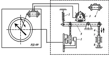 Принцип дії приладу оснований на статистичній залежності між крупними і дрібними класами в досліджуваній пульпі. Ґранулометр складається з датчика та вторинного реєстраційного приладу зі шкалою вимірювань від 0 до 1 мм. Датчик складається з мікрометричного щупа 7, що шарнірно з'єднаний за допомогою штока 6 з коромислом 5, до якого підвішений плунжер індукційно-трансформаторного датчика 1. Щуп приводиться у зворотно-поступальний рух двигуном 4 через кулачок 3. У вихідне положення щуп 7 повертається пружиною 2. Розміри крупних частинок в пульпі, що автоматично контролюється за заданою програмою, вимірюють щупом 7, що разом з п'ятою 8 занурений у потік пульпи.