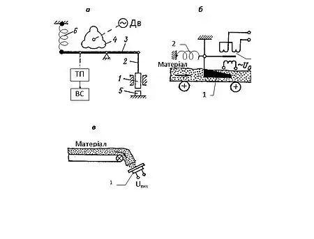 Способи автоматичного контролю гранулометричного складу можуть ґрунтуватися на безпосередніх вимірюваннях крупності частинок і непрямих методах. На рис. 1 а наведена схема гранулометра «Мікрон», що працює на принципі прямого вимірювання зернистих частинок твердої фази в потоці пульпи. Гранулометр може використовуватися в рудному збагачувальному виробництві. Чутливим елементом тут є мікроскопічний щуп (1), шарнірно сполучений штоком (2) з важелем (3), кінематично пов'язаним з трансформаторним перетворювачем (Пр). При роботі двигуна (Дв) кулачковий механізм (4) періодично підіймає щуп над п'ятою (5), в наступний момент вимірювання пружина (6) притискує його до п'яти. Зазор між цими елементами характеризує розмір одиничного зерна, що потрапило в робочу зону. Сигнал, пропорційний величині цього зазору, за допомогою трансформаторного перетворювача переміщення (ТП) подається у вимірювальну систему (ВС), де відбувається інтегрування поточних значень розміру зерна, і середнє його значення фіксується вторинним приладом. Принцип непрямого методу оцінки крупності матеріалу в потоці ілюструється схемами, показаними на рис. 1 б і в.