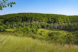 У верхній частині обривисті схили переходять у горизонтальну поверхню з лучно-степовими угрупованнями, де домінують костриця овеча, келерія гребінчаста, тонконіг вузьколистий з участю псамофітів та лучно-степових видів: молочай кипарисовий, полин дніпровський, підмаренник справжній, конюшина польова, чебрець подільський, чистець прямий, дивина борошниста, деревій благородний, очиток їдкий, самосил гайовий, перстач сріблястий, люцерна румунська, синяк звичайний.