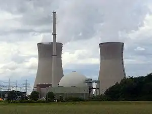 ![]() Графенрайнфельдська АЕС. Справа та зліва обидві градирні з природною тягою, посередині водо-водяний ядерний реактор. | |