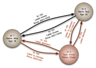 - Вершини або вузли представляють такі об'єкти, як люди, підприємства, облікові записи або будь-який інший об'єкт, який слід відслідковувати. Вони приблизно еквівалентні «запису», «відношенню» або «рядку» в реляційній базі даних або «документу» в документо-орієнтованій базі даних.