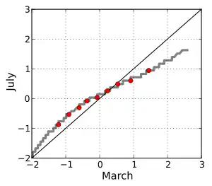 Якщо два порівнюваних розподілів схожі, точки в графіці Q-Q будуть приблизно лежати на прямій у = х. Якщо розподіли лінійно пов'язані, точки в графіці Q-Q будуть приблизно лежати на одній прямій, але не обов'язково на прямий у = х. Графік Q-Q також може бути використаний як графічний засіб оцінки параметрів в масштабі сімейства розподілів.