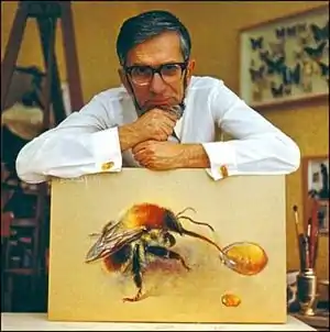 ![]() В. С. Гребенников і його акварель «Джміль біля краплі меду» (фото Юрія Лушина)[2] | |