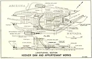 Будівництво греблі було намічене у вузькому каньйоні на кордоні між Невадою і Аризоною. Для відведення води річки Колорадо убік від місця будівництва були пробурені чотири тунелі діаметром 17,1 м в кам'яних стінах Чорного каньйону. Загальна довжина тунелів склала 4,9 км. Будівництво тунелів почалося в травні 1931. Оброблення тунелю було виконане з бетону завтовшки 0,9 м, у результаті корисний діаметр водовідводів склав 15,2 м. Після закінчення будівництва тунелі частково були перекриті бетонними «корками», а частково — застосовуються для подачі води до турбін і скидання надлишків води.