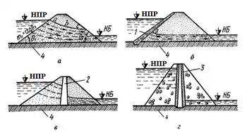 Греблі з ґрунтових матеріалів – насипи з ґрунтів, що мають у поперечному розрізі форму трапеції (рис. 1.). Укоси їх можуть мати закладення т (котангенс кута 0, що складається лінією укосу з горизонтом), які мінімально дорівнюють від 0,9–1,2 (для кам’яних) до 1,5 (для земляних гребель). Залежно від типу ґрунту та якості закладення схилу ці значення можуть сягати величини 3–5 і більше. Земляні греблі з пісків, супісків і легких суглинків є проникними для води, яка фільтрується через тіло греблі, насичуючи його до поверхні аbс (рис. 1, а), що називається депресійною кривою (кривою депресії). Для запобігання фільтрації через греблю в її тілі облаштовують водонепроникні зони, екрани (1) (рис. 1, б), діафрагми або ядра (2) (рис. 1, в). Ці водонепроникні елементи складаються з глини або суглинку, бетону та залізобетону, металу та інших матеріалів і змикаються з водонепроникною основою (4) греблі (рис. 1, а–г).