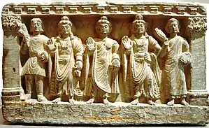 Тріада Будди та кушанська пара на колінах. 3-те ст.