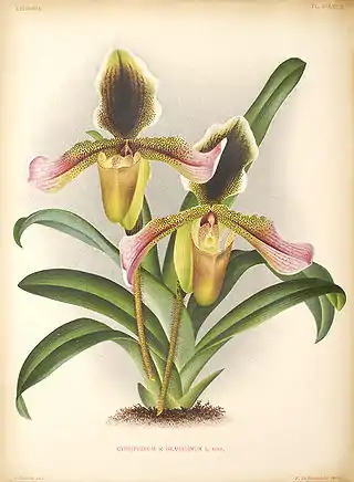 - Paphiopedilum lawrenceanum × Paphiopedilum callosum.