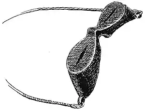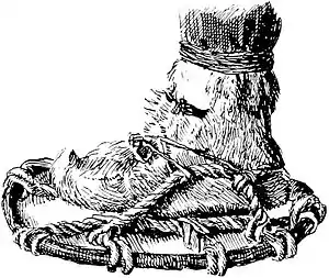 Предмети обладнання експедиції. Зверху до низу: Нарти, які сконструював Нансен; Саамська каньга з одягненими на неї валянками; Дерев'яні окуляри з прорізами для очей, захист від снігової сліпоти. |