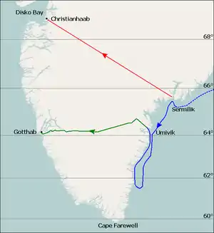 ![]() Перший початковий план маршруту Пунктиром позначено плавання на «Ясоні» 4 — 17 липня 1888 р. Суцільна лінія показує дрейф команди 17 — 29 липня і плавання до Умивіка Траса фактичного переходу в Готхоб 15 вересня — 3 жовтня 1888 р. | |
