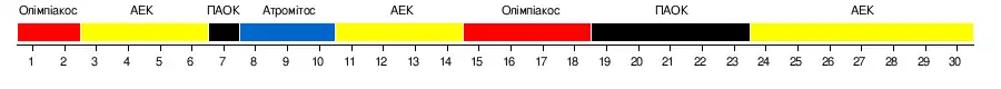 | Олімпіакос | 1:2 | 3:1 | 1:1 | 0:1 | 5:1 | 2:0 | 4:1 | 2:1 | 1:1 | 4:0 | 1:0 | 1:0 | 1:0 | 5:1 | 3:0 | |