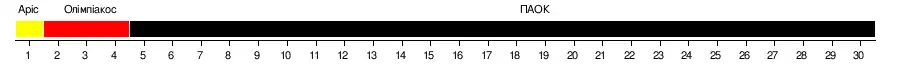 | 2 | Олімпіакос | 30 | 24 | 3 | 3 | 71 | 17 | +54 | 75 | |