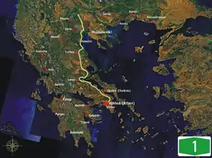 Шосе починається в передмісті Афін Кіфісі на північ від затоки Фалірон, паралельно проспекту Кіфіссіас, і продовжується на північ до міста Евзоні, прикордонного із КЮРМ, де грецький Автобан 1 переходить в трасу M1. До заміни номерів європейських маршрутів північна частина траси від Евзоні до Егнатія-Одос позначалась E5N. Сьогодні вся грецька національна автомагістраль 1 — частина E75. Нещодавно обслуговування ділянок автомагістралі передано приватному консорціуму, початкого як частину проекту з будівництва Іонія-Одос.