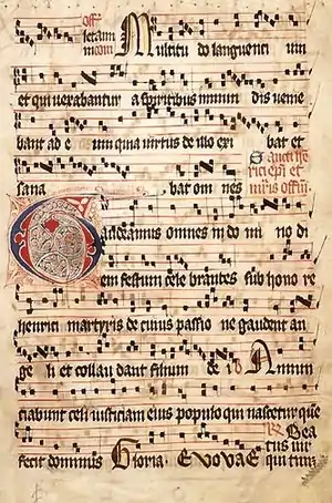![]() Gaudeamus omnes, вступ до меси св. Генріха Упсальського, записаний квадратною нотацією, XIV—XV століття. |