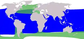 ![]() зелений: гринда звичайна, синій: гринда короткоплавцева | ||||||||||||||||||||