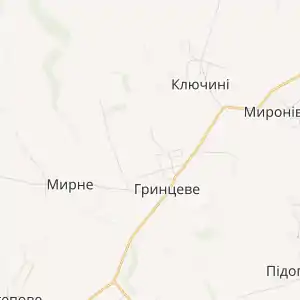 Село Гринцеве знаходиться на вододілі річок Сула і Грунь. Село складається з двох частин, рознесених на відстань 1 км. На відстані 1 км розташовані села Ключинівка, Мирне та Протопопівщина. По селу протікає пересихаючий струмок з загатою.