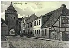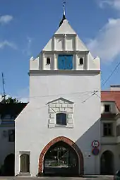 Міські брами мають змішаний готично-ренесансний характер, що є наслідком руйнацій і перебудов. У місті збереглись невеликі залишки міських мурів XIII/XIV, а також XVII століть. Одним з елементів системи оборони міста є Порохова вежа, збудована із цегли зовні нетинькованої з готичною перев'язкою. Використовувалась для стрільби.