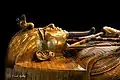 У жовтні 1925 року археологи приступили до дослідження трун-саркофагів. Тільки в першому з них були передбачені ручки, завдяки яким його вдалося підняти з кварцитового саркофага. З іншими двома довелося неабияк потрудитися і придумати спеціальну конструкцію з петлями для підйому лебідками[106]. Операцію сильно ускладнив звичай древніх єгиптян рясно умащувати мумію смолами й духмяними оліями. Їх було вилито у внутрішній саркофаг кілька відер. Останній — третій саркофаг був відлитий із золота. Останній і передостанній саркофаги частково приклеїлися один до одного вилитою в них сумішшю смол і олій. Спочатку їх довелося піднімати разом. Після цього вдалося розгледіти мумію і чудовий зразок давньоєгипетського мистецтва — маску з кованого золота, що покривала її голову. Для того, аби відділити саркофаги й мумію одне від одного дослідникам довелося акуратно поставити конструкцію на підставки й нагріти її примусами. Сама мумія і дерев'яні елементи охолоджувалися пластинками цинку і мокрими ковдрами. Після цієї вельми ризикованої операції всі елементи вдалося роз'єднати й звільнити мумію для подальшого вивчення. Подекуди поверхню всередині саркофагів від затверділої суміші смол та олій довелося звільняти за допомогою стамесок[107][108].
