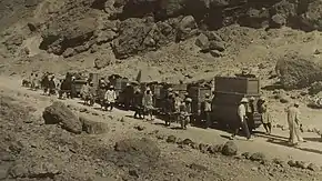 З грудня Картер організував процес транспортування. З усіх можливих способів перевезення археолог вибрав тимчасову «Декавілевську» вузькоколійну залізницю. Невелика гілка використовувалася для вивозу щебеню при розчищенні Долини, але її довжини не вистачало. Робочі збирали залізничне полотно перед вагонетками та розбирали позаду. Відстань в 9 км до берега Нілу було пройдено приблизно за 15 годин. Після цього упаковані вантажі переправлялися пароплавом в Каїр. Найцінніші предмети під озброєною охороною згодом переправили з Луксора залізницею[71].
