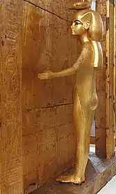 У західній стіні знаходився незамурований прохід до скарбниці. Тут збереглися похоронні предмети найвищого художнього рівня. Вхід в неї, як наказано Книгою мертвих, охороняли символи загробного світу: статуї бога-шакала Анубіса на ношах, і голова корови Мехурт (одне із втілень богині Хатхор). У центрі кімнати впадав у око оббитий золотом ковчег і чотири статуетки богинь в охоронних позах навколо нього. Статуетки справили найбільше враження на Картера серед усього, що він виявив у скарбниці гробниці[76]. Огляд показав, що злодії побували й тут. Втім, на перший погляд найцінніші предмети (статуї й малий золотий ковчег) пошкоджені не були. Картер розпорядився тимчасово закрити скарбницю дерев'яними дверима, щоб вона не відволікала, і приступити до неї пізніше[73].