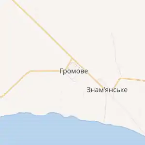 Громове — село на південному сході району, у степовому Криму, в 2 км від берега Каламітської затоки Чорного моря, висота центру села над рівнем моря - 40 м. Найближчі населені пункти — Знаменське в 1 км на південний схід і Окунівка в 7, 5 км на південний захід. Відстань до райцентру близько 18 км, найближча залізнична станція - Євпаторія - приблизно в 67 км.