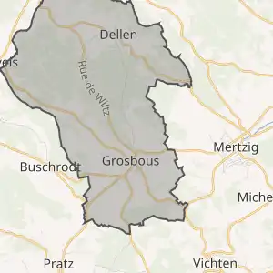 | Комуна Гросбус (помаранчевий), кантон Реданж (темно-червоний) та округ Дікірх (темно-сірий) на карті Люксембургу | ||||
