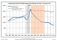 Динаміка населення з 1875 року в сучасних кордонах (Синя лінія: населення; Пунктир: відносна порівняльна динаміка населення землі Бранденбург; Сірий фон: період Третього рейху; Помаранчевий фон: період НДР)