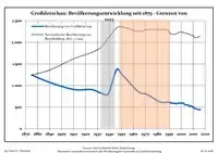 Динаміка населення з 1875 року в сучасних кордонах (Синя лінія: населення; Пунктир: відносна порівняльна динаміка населення землі Бранденбург; Сірий фон: період Третього рейху; Помаранчевий фон: період НДР)