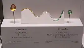 - ґросуляр-андрадит (алюмініїсто-залізистий мінеральний вид групи ґранатів — Ca3(Al, Fe)2[SiO4]3; склад і властивості змінюються від алюмініїстого до залізистого різновиду);
