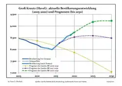 Динаміка населення з 1875 року в сучасних кордонах (Синя лінія: населення; Пунктир: відносна порівняльна динаміка населення землі Бранденбург; Сірий фон: період Третього рейху; Помаранчевий фон: період НДР)
