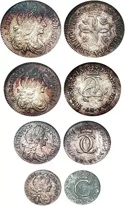 Спочатку для подарунків Монді використовувалися срібні пенні звичайного карбування. Карбування спеціальних монет Монді почалася в царювання Карла II у 1662 році, рік карбування на монетах не вказувався. Монети карбувалися номіналом у чотири пенси, три пенси, два пенси і один пенні. З 1670 року на монетах Монді вказується рік карбування [5].