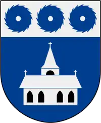Сюжет герба: у синьому полі срібна церква, у срібній главі три сині круглі пилки в один ряд.
