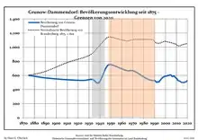 Динаміка населення з 1875 року в сучасних кордонах (Синя лінія: населення; Пунктир: відносна порівняльна динаміка населення землі Бранденбург; Сірий фон: період Третього рейху; Помаранчевий фон: період НДР)