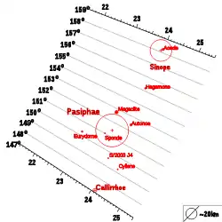 Діаграма показує орбіти та розміри супутників групи Пасіфе. Горизонтальна вісь діаграми ілюструє приблизну відстань від Юпітера, вертикальна вісь діаграми — нахил орбіти, величина круга — розмір супутника.