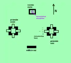 У давнину храми на вершинах пірамід були відсутні в принципі або представляли собою легкі споруди з глини та очерету. Біля західної основи східної піраміди зазвичай встановлювалося декілька гладеньких стел й вівтарів. З південного боку група замикалася довгоюм будівлею (в Яшха з 9 дверима), в той час як з півночі до площі долучається будівля, яку визначили як «відгороджене місце». Це будівля з 4 кам'яними стінами і входом з південної сторони, що не має кам'яних перекриттів. У центрі цього незвичайного приміщення знаходиться скульптурна пара стела-вівтар.