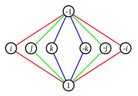 Множення елементів {±i, ±j, ±k} подібне до векторного добутку ортів в тривимірному евклідовому просторі.