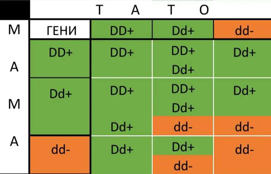 Успадкування Rh (резус-фактора) крові. Ген, що кодує резус-фактор D (Rh), є домінантним, алельний йому ген d — рецесивним (резус-позитивні люди можуть мати генотип DD чи Dd, резус-негативні — лише генотип dd). Людина отримує від кожного із батьків по 1 гену — D чи d, і у нього можливі, таким чином, 3 варіанти генотипу — DD, Dd чи dd. У перших двох випадках (DD і Dd) аналіз крові на резус-фактор дасть позитивний результат. Лише при генотипі dd людина буде мати резус-негативну кров.[29]