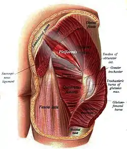 ![]() М'язи сідниці ззаду (видно грушоподібний м'яз та решту латеральної групи обертачів) | |