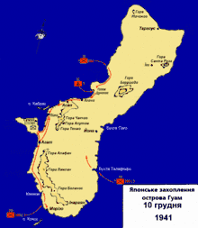 ![]() Головна висадка японців на острові Гуам. Малюнок Кохей Азукі. | |||||||