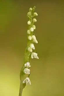 Суцвіття — однобічний колос, 4-15 см завдовжки, складається з 7-36 дрібних квіток, розташованих по спіралі. Квітки двостатеві, зигоморфні, п'ятичленні, запашні, білі або кремово-білі, завширшки 3-7 мм. Листочки оцвітини опушені тонкими білими волосками. Губа завдовжки близько 4 мм. Плід — коричнева коробочка. Насіння надзвичайно дрібне, 1000 насінин важить лише 2 мг.