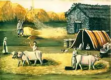 Первісно на гумнах молотили вручну (за допомогою ціпів), з другої половини XIX ст. почали з'являтися ручні, кінні та парові молотарки.