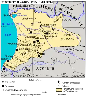 Гурійське князівство охоплювала області Гурія з містами Поті й Озургеті та Ачара (Аджарія) з містом Батумі.
