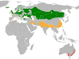 ![]() Ареал поширення сірої гуски Гніздування Зимування Інтродуковані популяції | ||||||||||||||||||