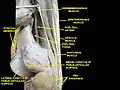 ![]() М'язи сідничної і задньої стегнової ділянки. Зона гусячої лапки обведена кільцем унизу. кравецький, тонкий, півсухожилковий півперетинчастий м'язи позначені унизу ліворуч. | |